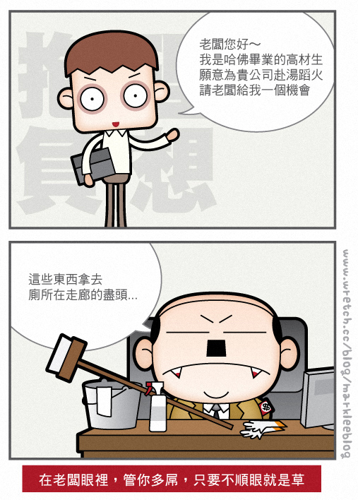 因為時代的進步,化妝技術一日千里,所以女生只要認真打扮都能力挽狂瀾,可憐的就是男生了,除了藝人,男生大多是不化妝的,所以身為男生在老闆面前就是要認命,不要妄想好色的老闆會對大家一視同仁,連孔老夫子都說︰「食色,性也」,關於好色這點,我們面對老闆只能見怪不怪啦!