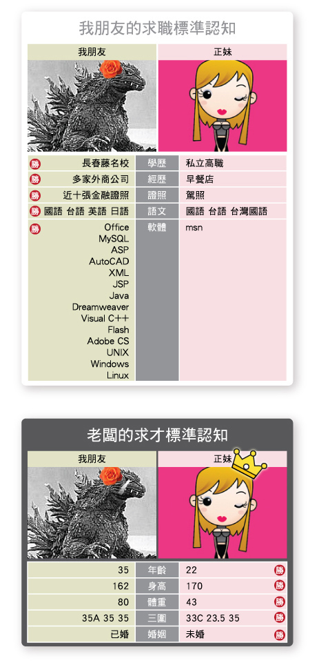 以上可是真實發生在我朋友身上的故事,她足足沮喪了六個月才勉強走出陰霾,事後我們討論問題點出在哪,藉由以下的表格大家會更清楚她與正妹在應徵上認知的差異: