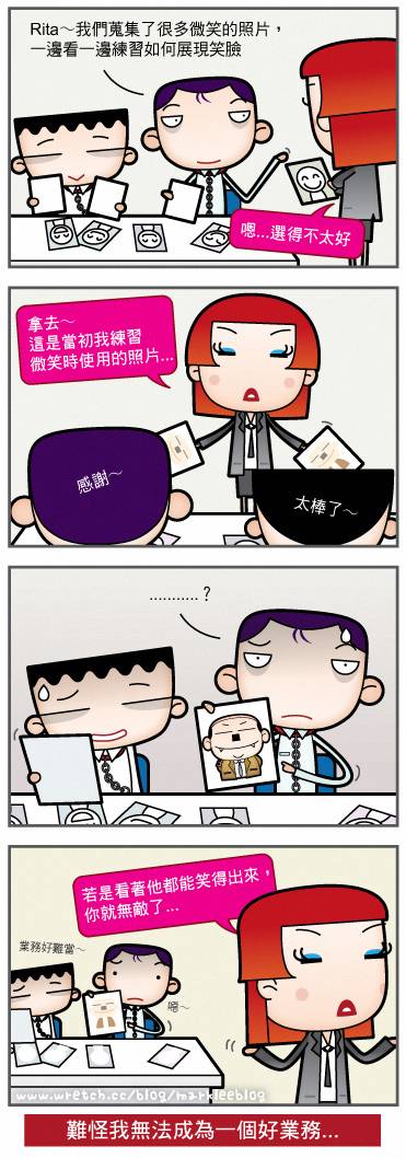 相信我,要平白無故的見人就笑實在很難,不信你自己對著鏡子笑個十分鐘試試看。所以厲害的業務人員一定在〝笑容〞上下過苦功。以美國保險界名人威廉 . 拉懷來說, 他曾經蒐集了上百張笑臉的照片貼滿了整個屋子,每天練習大笑幾百次,終究練成了號稱『價值百萬美元的笑容』 ,其痛苦的過程大概僅次於練葵花寶典的東方不敗。