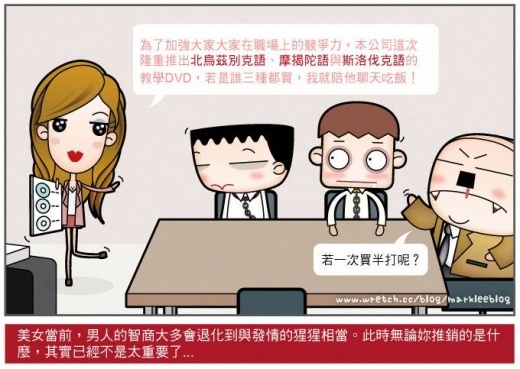 所以長相平庸的我後來痛心的得到一個重要的結論,就是 長相優的人絕對算是種上天的恩賜 ,而且絕對屬於最有殺傷力的天分之一。尤其是在做業務這方面,你(妳)就好比是隻站在火雞堆中的亮麗孔雀,想讓人不注意到都難,所謂好的開始是成功的一半, 才起步就贏了一半,之後再適度的演幾齣孔雀開屏,我們這些做火雞的也只能在旁邊咕咕哀號等著進烤箱了 ...
