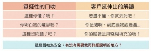 若你擔心對方不理解你要用什麼方法搾乾他的荷包,請切記不要用質疑的口吻,因為這樣的口吻會讓可戶產生其他解讀。