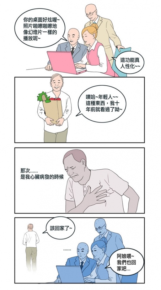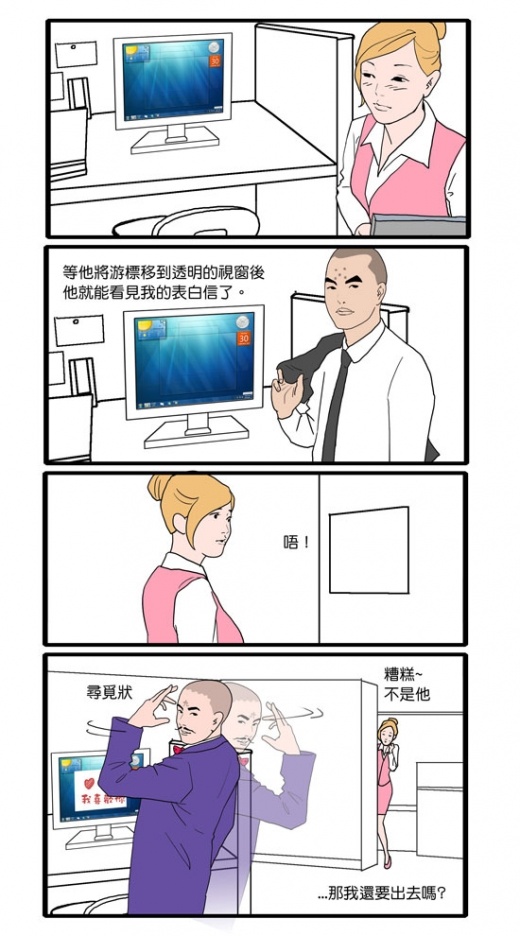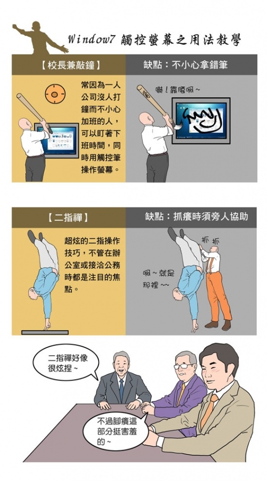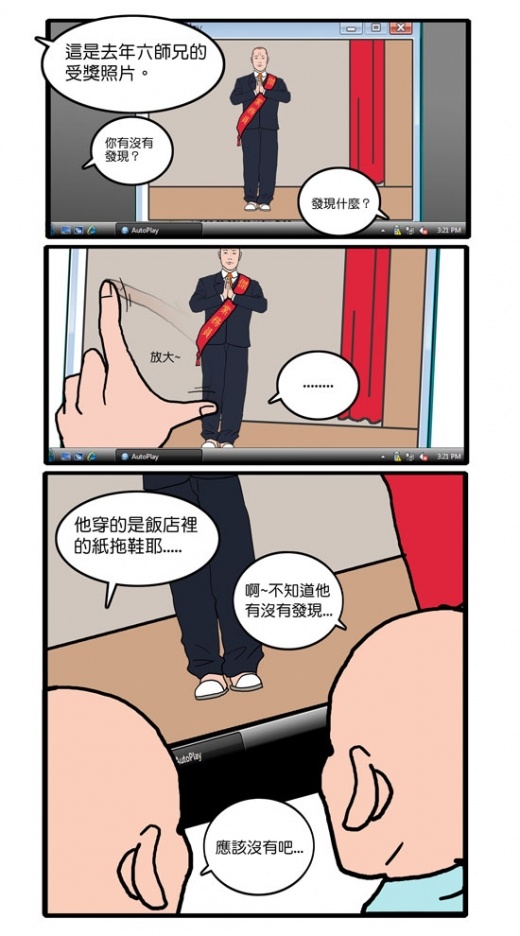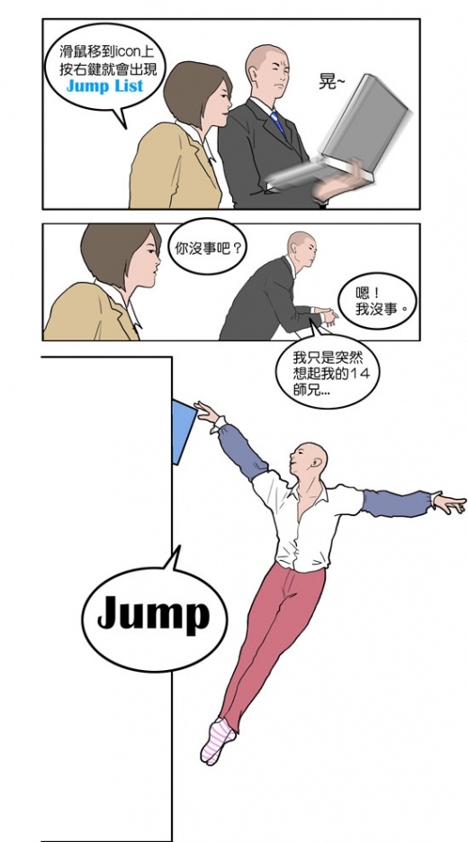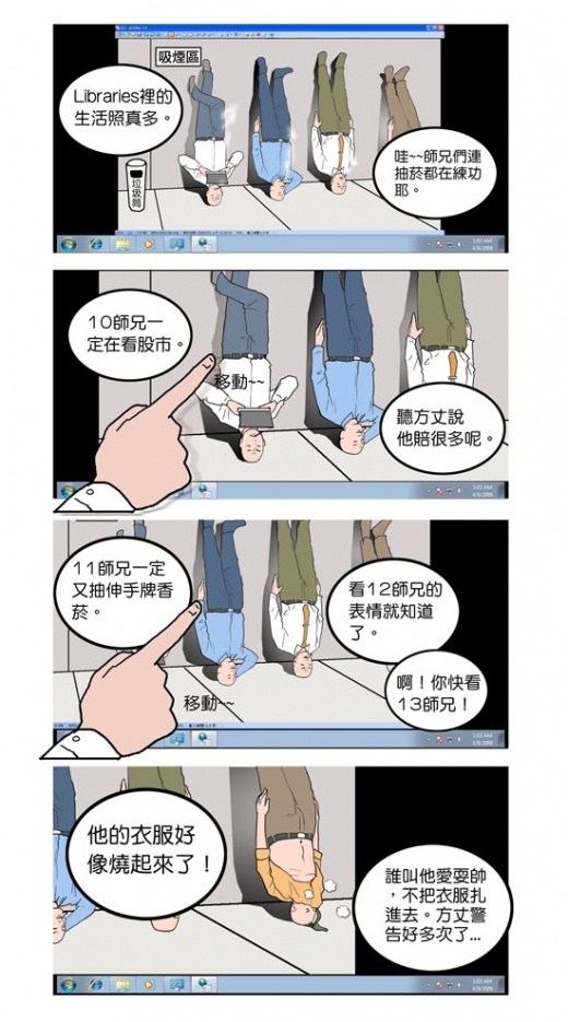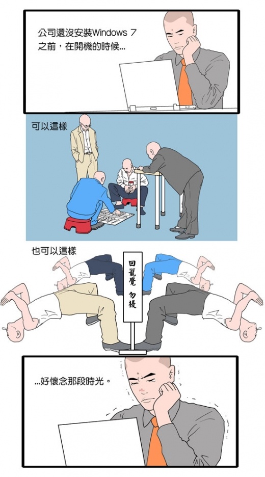 這是流傳於台灣微軟廁所的漫畫「十八同仁」,非常無厘頭,很有「吉田戰車」的 Fu,每個漫畫其實都在介紹 Windows 7 一些很特別的功能,內容相當有趣;不知道你能不能看的出來在講什麼?開機後你以為還有時間可以沖碗泡麵外加 call 人打屁嗎?面對全新的 Windows 7 ,你可能得重新思考一下開機後的動線與生活了!