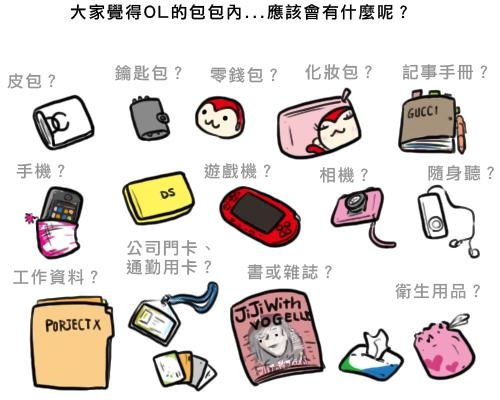 之前因為忙於其他工作,而一直沒時間更新部落格的「輔大猴」,某天在捷運上親眼看到一個上班女郎包包內的東西,實在太有創意,讓他驚訝到即使沒睡覺,也要把這篇圖文畫出來。究竟那位OL包包裝了什麼東西?一起來看看吧。