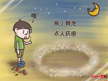 把小鞭炮拆開,火藥粉撒地上圍成個圓,用火柴一點搜一下,整個圈圈燃亮,好開心~