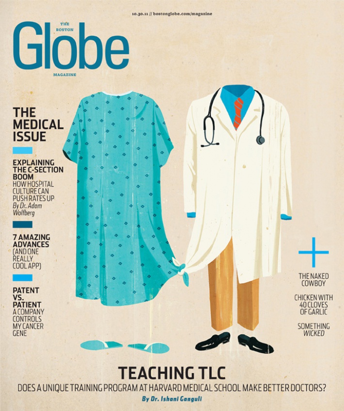 ▲波士頓環球雜誌封面插畫(醫師與病患的緊緊相依?)