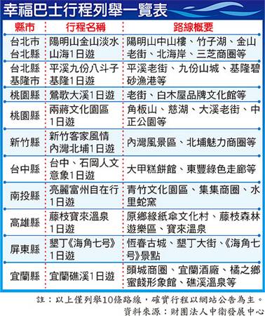 值得注意的是,每條旅遊路線集合出發的地點都不同,民眾若要省錢還是就近報名參加;而全台各縣市都會開出幸福巴士,如北部將有陽明山、九份、宜蘭礁溪、桃園兩蔣園區、新竹客家風情等1日遊,去年紅極一時的《海角七号》之旅及轉型結合觀光的白木屋糕餅廠、觀光酒廠都將出現。