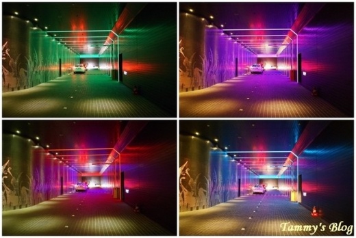 燈光顏色不斷變化,好像時光隧道一樣的車道。