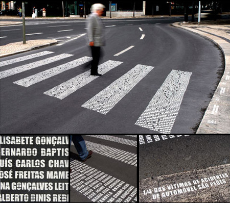 而這段斑馬線,是由許多英文字組成,但∼這可不是在玩文字創意,上面都是因交通事故而成受害者的名字,有一段文字特別寫著,有四分之一因交通事故而失去寶貴生命的受害者,不是坐在車內,而是走在馬路上的行人!