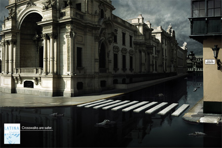 在巴西的這條斑馬線上,它的不平凡是將斑馬線變成商品條碼,像在提醒人們,快快來消費,馬路上還大剌剌的寫上購物中心的名稱∼