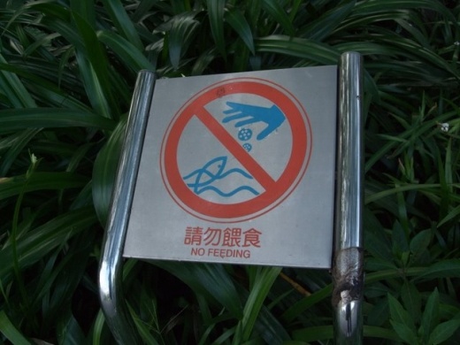 請勿餵食標示上週末天氣特好,傍晚跑去台大的生態池逛逛,除了被悶壞的都市人山人海,還有鴨啊,麻雀,或是魚和烏龜,沒有一個不出來透氣,可能是接近傍晚的時候,晚餐時間快到了,每一種生物都吃得超開心。