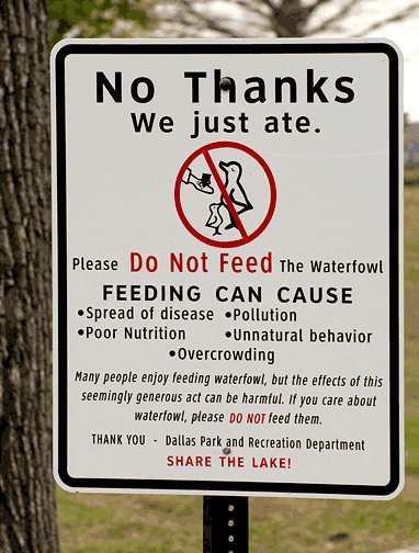 同樣的問題,也出現在國外的各種地方,譬如說,請勿餵食鴿子得標示一點用都沒有: