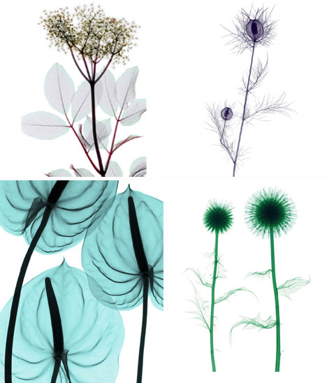 接骨木花(左上)、黑種草(右上)、火鶴花(左下)和薊(右下)。這些彩色的X光照片,幫助我們更深刻認識自然界的複雜美。表面上看起來簡單的花朵,在X光下顯露出它們隱藏于內部複雜而美麗的架構。看起來平淡無奇的植物,在X光下顯露出它們真正奇異的本質。
