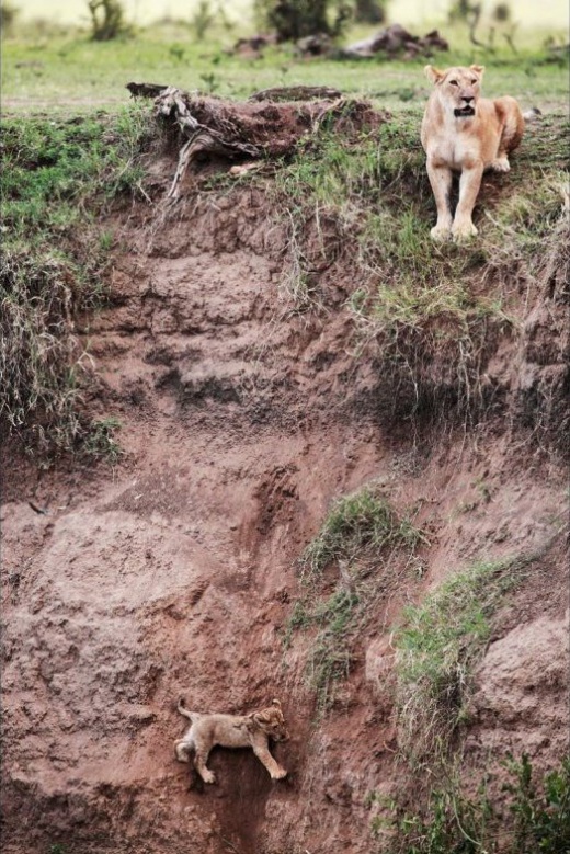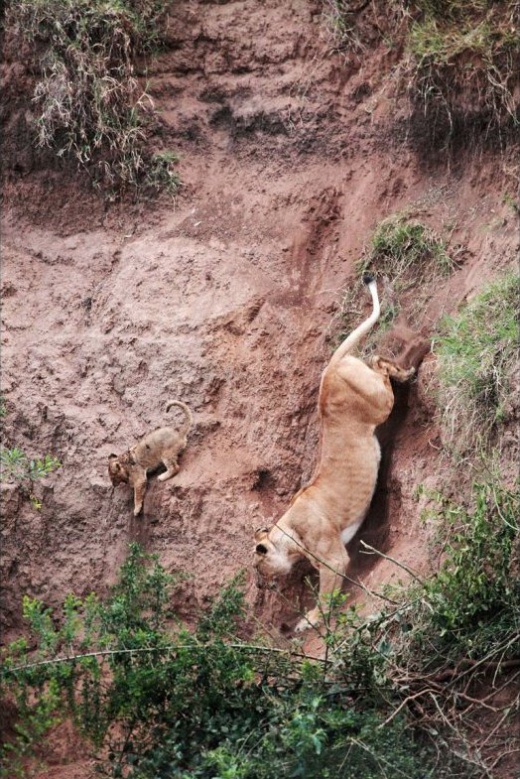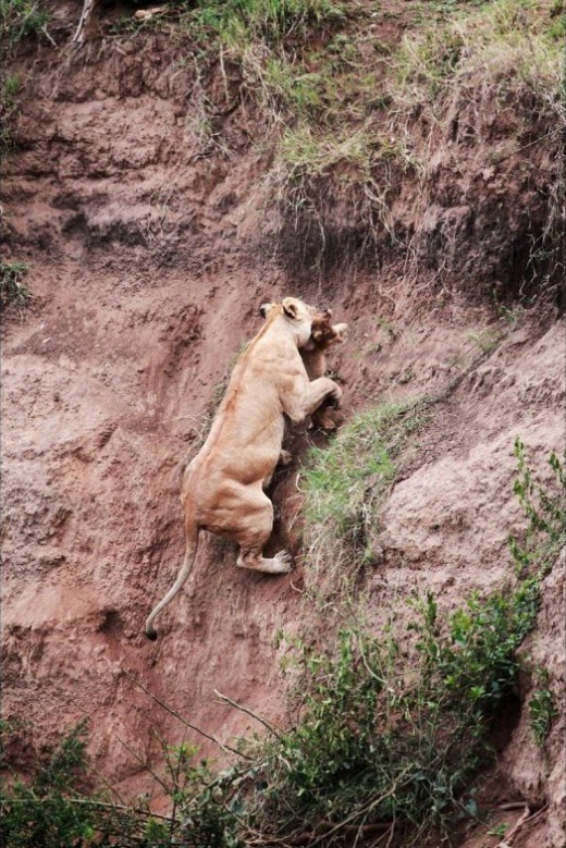 當幼崽精疲力竭即將墜落懸崖的一瞬間,母獅將它叼了起來