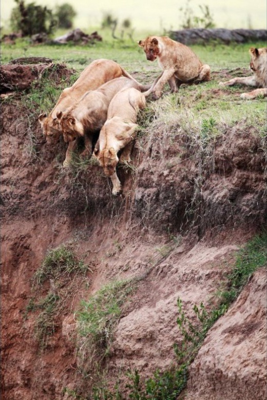 在另一幅圖片中,在開展營救任務之前,一些獅子還仔細的檢查懸崖邊緣,因為這些懸崖很可能會導致其營救任務失敗。此時,小獅子的母親慢慢的、小心翼翼的下到那已經極度恐懼的小獅子被困的地方。用其有力的爪子抓住峭壁以此來穩住自己搖搖欲墜的身體。