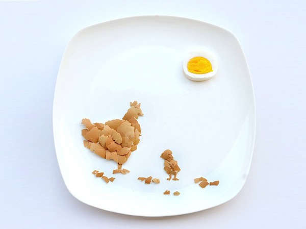 RED 創作的畫布就是這塊小小的白色磁盤,而她的顏料則是各式各樣的食物與醬料,主題與風格也相當多元,有利用雞蛋與蛋殼所完成的溫馨可愛親子雞,還有櫻桃醬與番茄搭配而成的愛心氣球,這樣純真浪漫的畫面應該融化了不少人的心。