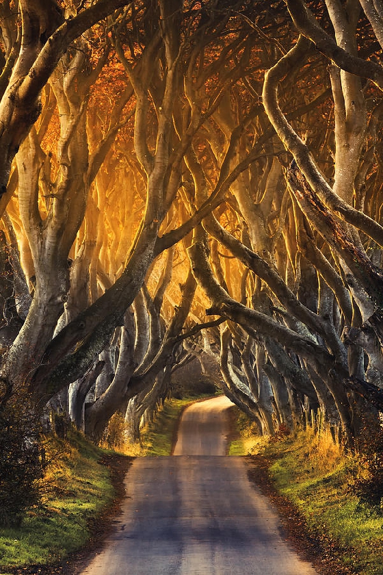 位於英國北愛爾蘭地區的黑暗樹籬,是由一整片山毛櫸樹形成的樹林。這些樹都已經上百歲了,交織的樹幹形成一個隧道口般的弧形,也造成一些潛在的道路危險(像是被樹戳到?)這片童話般的樹林已經成為熱門的觀光跟攝影景點。