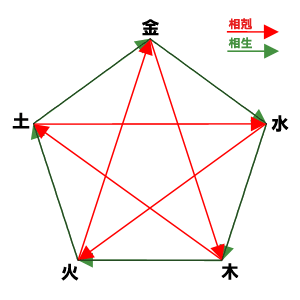 舉金這個元素為例,金會生水、剋木,卻也被火所剋、被土所生。另外四個元素也都存在和其他元素的生剋關係,而且生剋的關係各自形成獨立的迴路,循環不止。