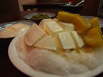 什麼是豆腐冰?它是用鮮奶、杏仁與抹茶三種原料提煉而成的,過程複雜而繁瑣,而且必須極速冷凍,外觀看似豆腐,用湯匙壓下去非常有彈性,尤其杏仁豆腐,使用天然杏仁磨製,少了嗆鼻,多了杏仁清香。