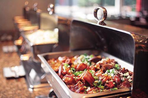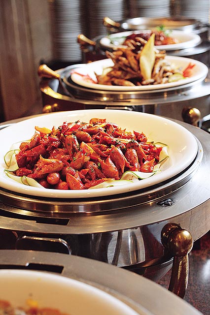 在平日四百元以下價位的飯店午茶中,「王朝大酒店中庭咖啡廳」每天推出約五、六十道菜餚,豐富性略遜,但熱食區品質不遜色,像「脆皮雞」只用去骨雞腿肉,口感軟嫩香味十足﹔「橙汁排骨」用的是小肋排,肉多骨少,很惹味﹔又如「海鮮蒸蛋」,一舀開海鮮料盡現,相當捨得。冷盤變化不多,「醋拌小章魚」「鯊魚煙肉」味道都很道地。