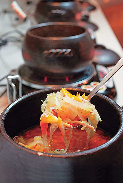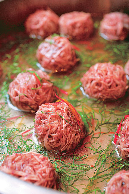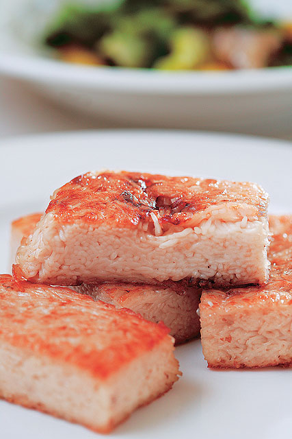 中式菜餚強調陳列的視覺美感,一掀開鍋蓋,直徑約6公分的「芋香球」,就如同美麗的紫色絲球在水裡停泊;熱湯區裡的「柳松胡瓜」則是將瓠瓜與柳松菇、金針菇、金針花等切成粗絲再入鍋熬煮,清甜爽口。到了點心區,以麵線摻入麻油、香菇後煎成厚餅再切成長塊的「長壽糕」,看外形就想吃。