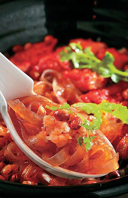 紅豔懾人的「酸辣粉」美味都在碗底,拌開儘速吃,能嚐出美妙。(90元╱大碗,附湯)