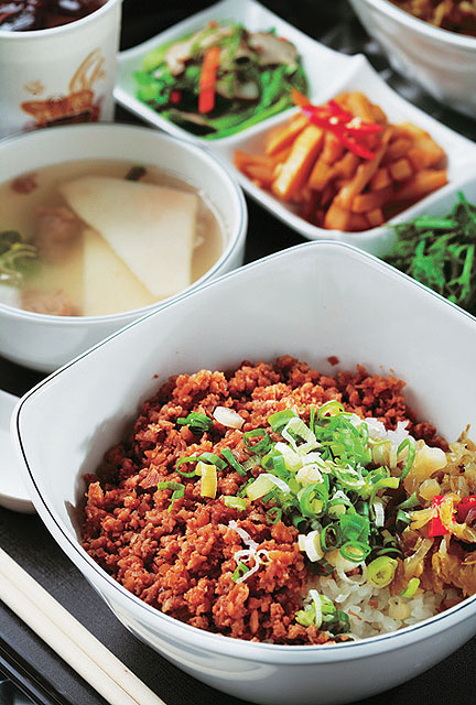 在台北連嚐2次敗績、鎩羽而歸的大陸名店譚魚頭,如今在高雄漢神巨蛋美食街裡改名為「川蜀魚頭」後,專營川味小吃,表現亮眼、人氣鼎盛。不辣的「崇洲渣渣飯套餐」看來其貌不揚,卻有驚人的美味,將炒香的肉末搭上手工細剁的榨菜一起翻炒,添上老抽與雞湯,就是渣渣。配上酸菜與蔥末與飯搭配,香味好下飯,套餐附3道小菜及新鮮例湯與酸梅汁,相當划算。