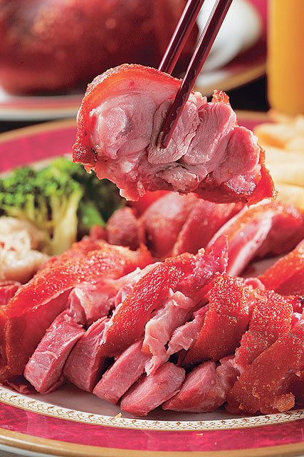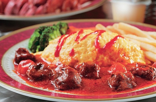 同在美食街的「高雄空廚」,以價格與分量都相當誘人的「全家福脆皮德國豬腳」虜獲消費者,每個至少1斤半,完整的豬腳醃過後先炸再烤,外脆內嫩,蘸芥末醬提味更顯香鮮。另外「英式燉牛腩蛋包飯」,選用帶筋部位燜煮軟爛,搭上紅酒與洋蔥,悠香迷人。