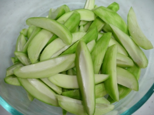 上星期逛市場, 看到攤上有賣這硬硬綠綠的芒果青, Q 爸說, 怕我不會做情人果, 所以先買一點試做看看.