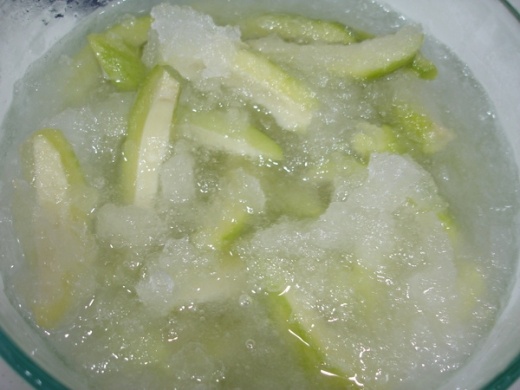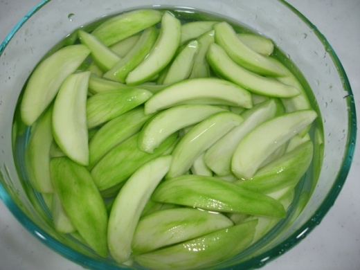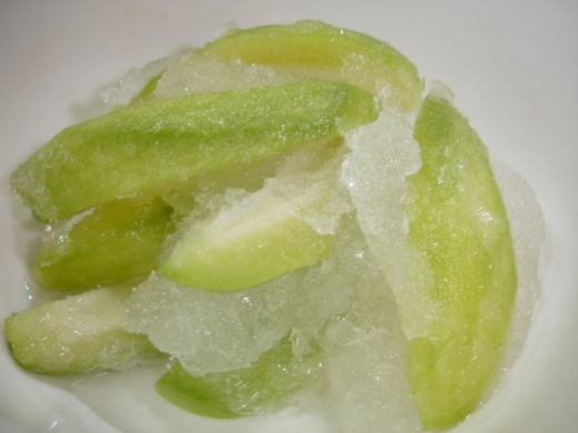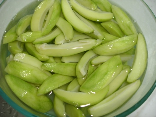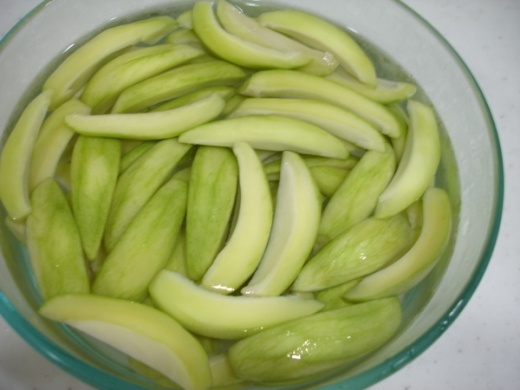 就買芒果青回來,去皮以後切塊泡鹽水(不要太鹹阿,不然會有奧妙的味道),然後再加糖(冰糖 紅糖 都好啦,不過紅糖出來的顏色會比較深)
