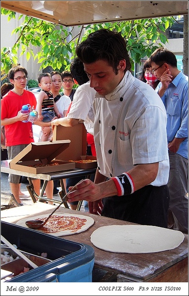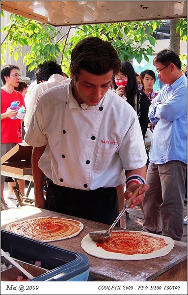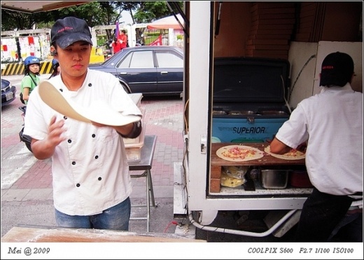 08-餐車運作情形(Hnas甩餅皮、Chris烤Pizza、另一個負責點餐 收錢 給Pizza)