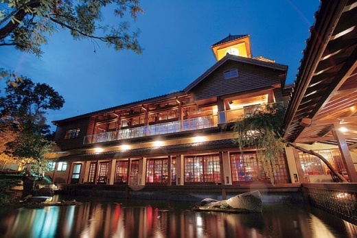 池水倒映著金碧輝煌的餐廳,是「又見一炊煙」最經典的夜景。