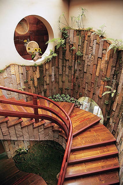通往二樓的迴梯有店家刻意營造的水幕牆,以及老闆的花道作品。