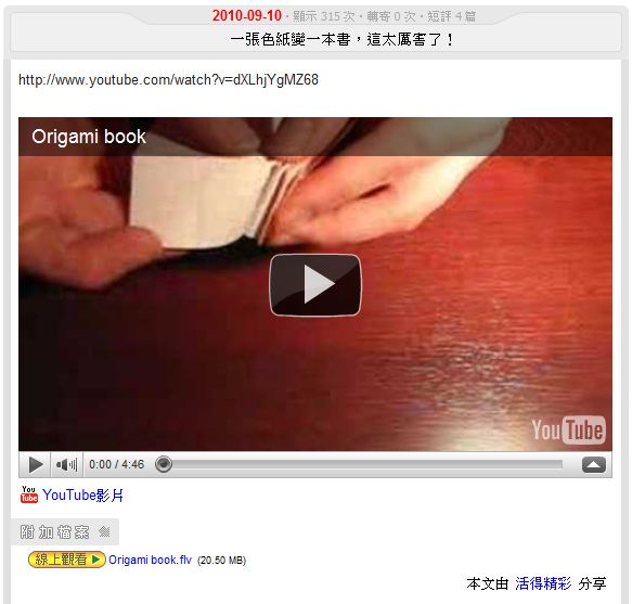 youtube .. 讚!! 在以前, 記得站長說過, post link 的壞處. 現在可以這樣的連結,定可讓大家有更多的吸收!