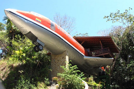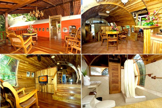 What a creative idea! Joanne Ussary bought a used Boeing 727. She paid $2,000.00 for the plane. It cost $4,000.00 to move and $24,000.00 to renovate. (She has a LOT of wood and specialty windows for $24,000! I want her carpenter!) But not bad for a $30,000.00 investment... The stairs open with a garage door remote and one of the bathrooms is still intact. There is a personal Jacuzzi in the cockpit. The Boeing home is featured as part of a collection of creative conversions. It has a spectacular view!