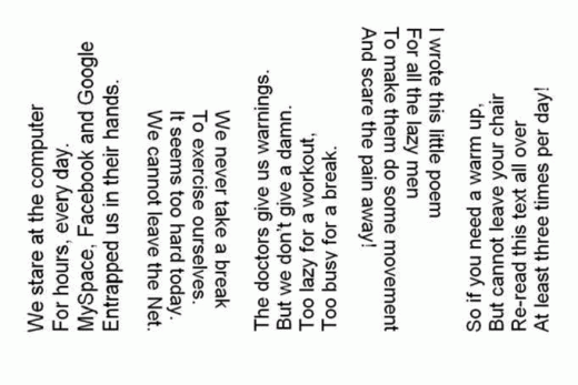 注意那段文字,故意往左往右傾斜打字,你要看懂這些字就得左右擺頭,.....。意思就是,文字內容是假的,要你動動脖子,舒緩一下才是真的。 ![]() | |
