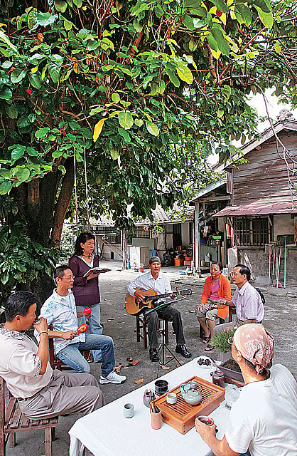 小店中庭的蘋婆樹下,是「二水彈唱」的聚會所,這天遇上樂團深情彈唱台語老歌,彈唱三人組每逢週六晴朗的夜晚在二水車站前表演,我跟著傾訴在地文化底蘊的嗓音神遊,彷彿感受到二水催情的夜了。