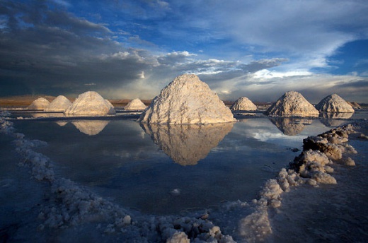 從鹽沼中收穫這種礦物財富並不是一件輕而易舉的事情。含鋰的鹽水從地底下被抽上來以後,置入一系列的蒸發池以去除水分。