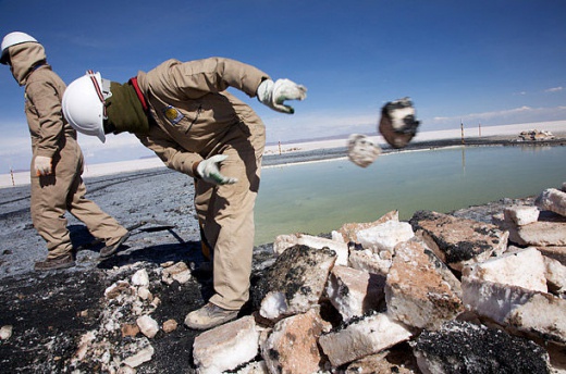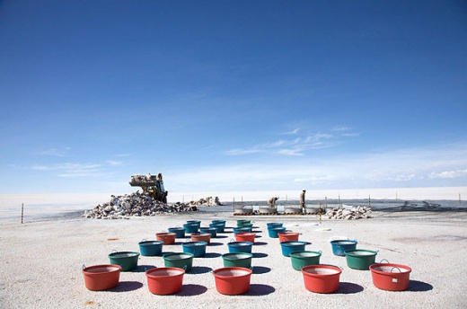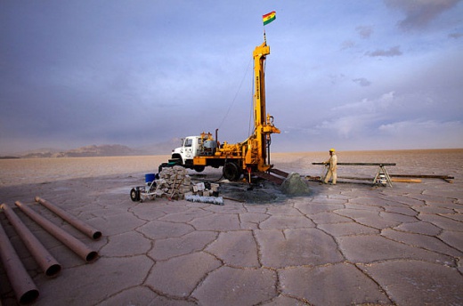 鹽沼中的機器設備上有玻利維亞國旗在飄揚。目前,全世界生產出來的大部分鋰都用在了移動設備的電池中,但是隨著汽車電池市場的興起(單塊汽車電池需要14公斤到20公斤的鋰,而小型電池僅需要30克),玻利維亞人的鋰礦將會越來越炙手可熱。