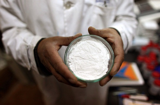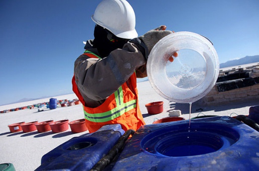 一位玻利維亞化學家正在展示提取出來的少量碳酸鋰。一家由玻利維亞國家礦業公司經營的試驗工廠最近正在利用不同的提取方法生產少量的碳酸鋰。玻利維亞政府目前對碳酸鋰的生產過程實行嚴格控制,只允許外國公司和科學家以科學顧問的形式協助研究。