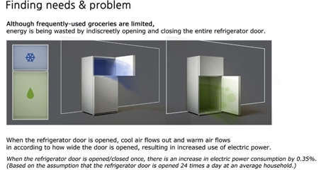 雖然目前還是概念型冰箱,但要發現問題、解決問題,先來構思一下!大家的冰箱都是兩個門,就算只是拿個飲料,就算開門取物一秒鐘,冷氣能源還是整體百分百被釋出,有沒有更好的方法?