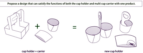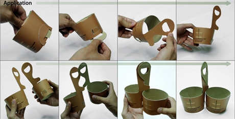 以熱飲外帶杯來說,只是加個手提環,輕而易舉,兩杯就可提著走,不只有防燙功能,還能方便手提,也比傳統的四格紙型設計環保許多。