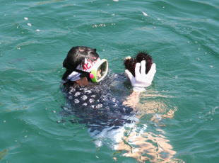 後來海女們開始戴護目鏡,腰繫救生繩潛入海水較深處,