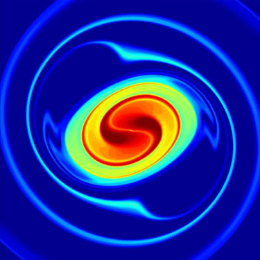 圖中看到是兩個流體漩渦相互吸引、旋轉和融合的奇妙圖像。這種自然行為感應現象到處都有,從大氣雲圖的產生到核聚變裝置的運行。最開始是兩個漩渦中心(圖中暗紅色部分),隨著螺旋紋和衝擊波擴散到整個背景流體,最後兩個漩渦互相環繞、互相結合。在圖中,二維液態漩渦彼此吸引,形成旋渦並融合形成涌動的華爾茲舞蹈。這種具有視覺衝擊效果的天然效應可形成於大氣層的氣候變化、核子融合裝置的實驗操作中。先進數字運算法則和高性能的超級計算機將詳細地顯示渦流的模擬動態狀況。