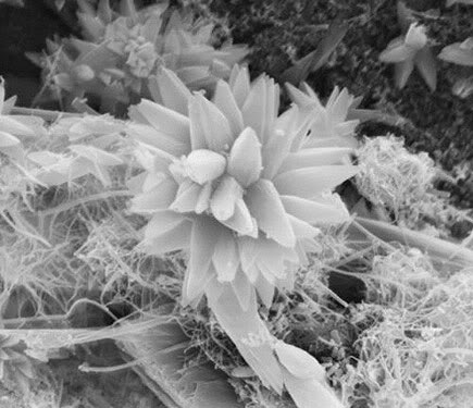 科諾莉一直在致力尋找一種在不破壞水泥微觀結構的前提下使其凝固的最好方法。她將水泥樣本放在溫度高達105攝氏度的烤箱內,於是就形成了如圖所示的水泥花,“花瓣”和“蓓蕾”清晰可見。