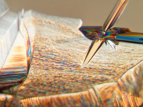 本圖是採用光學顯微鏡拍攝下來的晶體成長的過程。當硫酸鎂溶液冷卻時,於是就形成了瀉利鹽晶體和六水瀉鹽晶體。硫酸鹽礦物是金屬元素陽離子和硫酸根相化合而成的鹽類。由於硫是一種變價元素,在自然界它可以呈不同的價態形成不同的礦物。由於大多數硫酸鹽晶體都含有水,使得其最突出的物理性質就是硬度低,一般在2至3.5之間。另外,這種晶體的顏色一般為無色或者白色,比重一般也不大。硫酸鹽礦物的形成需要有氧濃度大和低溫的條件,因此地表部分是最適宜於形成硫酸鹽礦物的地方。在此類礦物中,外生成因遠比內生成因顯得更為重要。