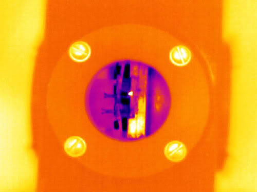 本圖是量子級聯激光器光線的熱成像圖。圓形窗口中心的那個明亮小點就是激光光線。由於波長原因,量子級聯激光器的光線通常不可見。通過熱成像相機,才拍下如此迷人的激光圖。激光熱成像儀具有不同於其它夜視儀的獨特優點,如可在霧、雨和雪的天氣下工作,作用距離遠,能識別偽裝和抗干擾等,已成為夜視裝備的發展重點,並將在一定成度上取代微光夜視儀。