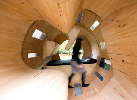 這圓柱體房子位於大學校園內,有足夠的空地讓房子滾來滾去∼主人正在示範如何滾動,是不是有點像…黃金鼠在牠的造型玩具裡跑來跑去?XD
