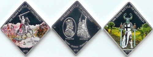 帕勞是前德國殖民地,制造這種硬幣,是為了紀念格倫瓦德戰爭600周年, 那是一場中世紀最大的戰爭。硬幣表面鍍銀,都畫有獨特的防掉色圖片,背面刻的是帕勞共和國的國徽紋飾。