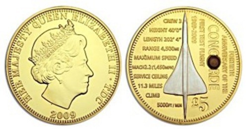 這枚硬幣是為了紀念協和式飛機首航40周年,在2009年鑄造的。硬幣表層鍍金,每面都含有一小塊從協和飛機上取下的鈦合金,將所有硬幣收集起來,你就可以建造一架迷你型和協式飛機了。