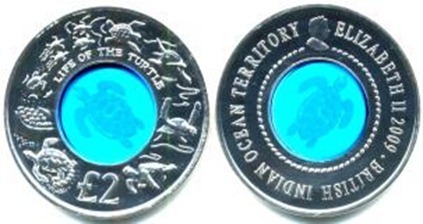 此硬幣面值為2鎊,由英屬印度洋領地制造,特征是在固體銀環中的藍色水晶中,嵌入了一只烏龜。有人說那只安靜的藍色烏龜,實際上是只活龜。